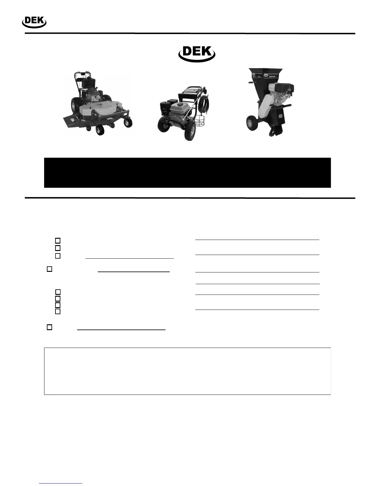 DEK® is registered trademark of GXi Outdoor Power, LLC Clayton, NC 27520 USA.