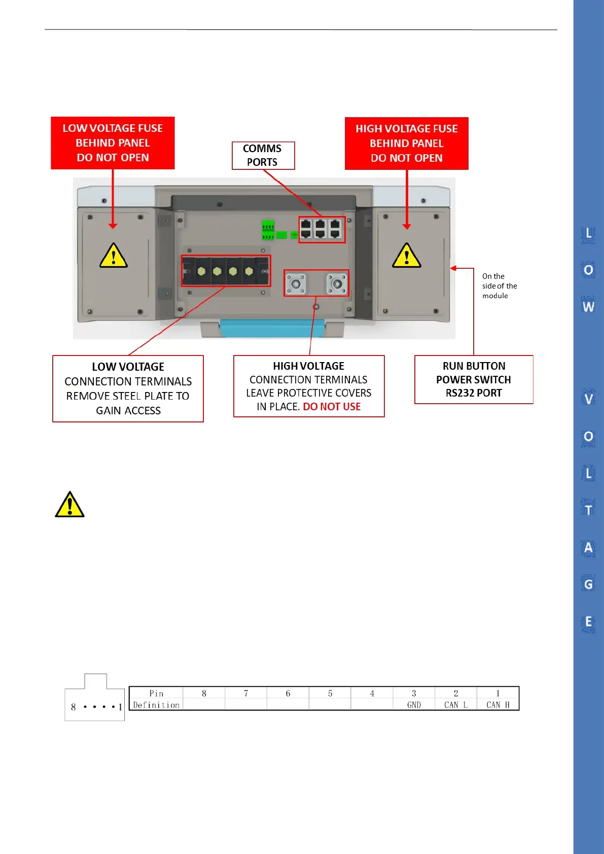 CAUTION: The LV fuse is contained in the left portion of the Battery Module as shown above.
