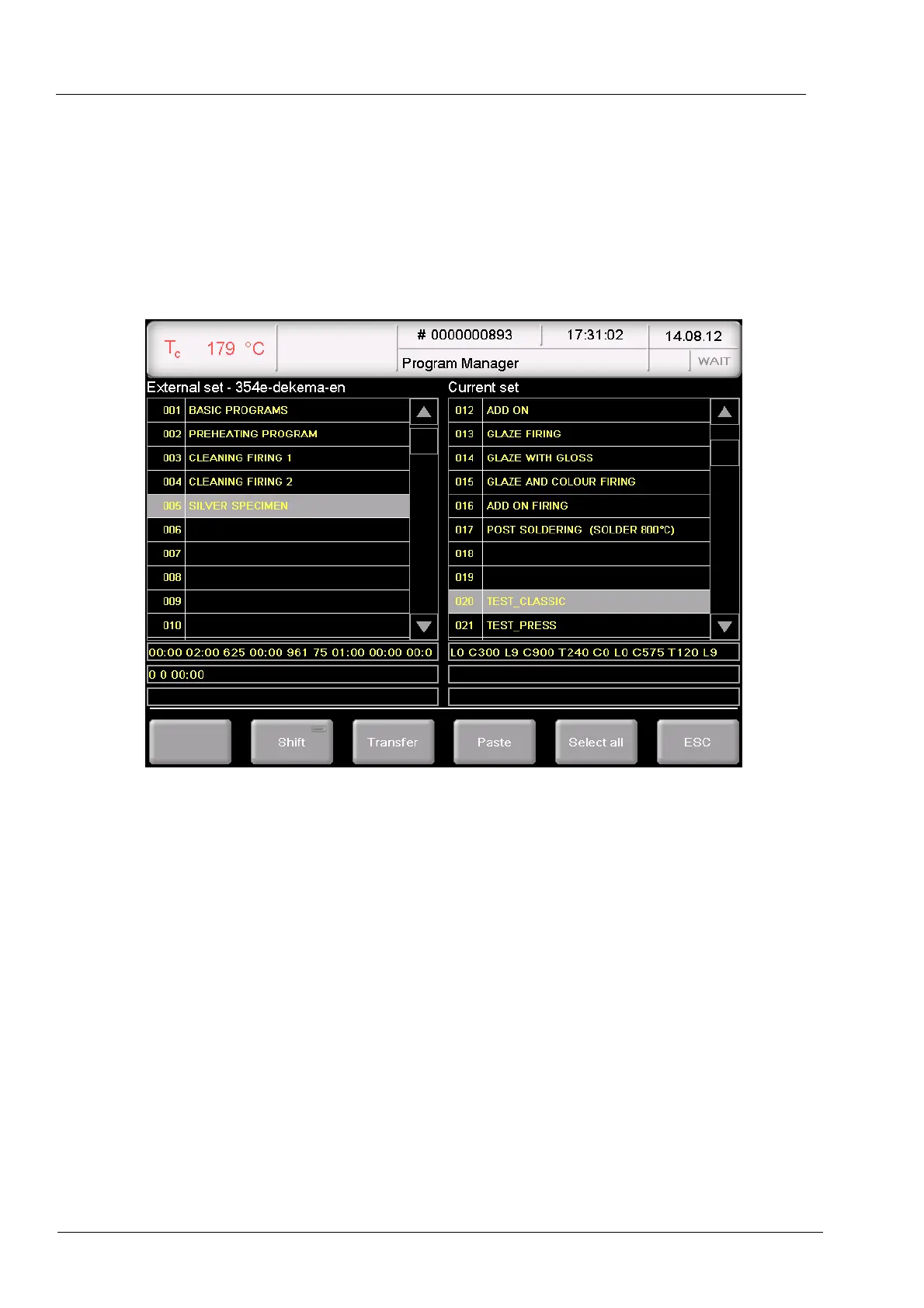 • The right table (“Current set”) shows the firing programs of the set that is being loaded
