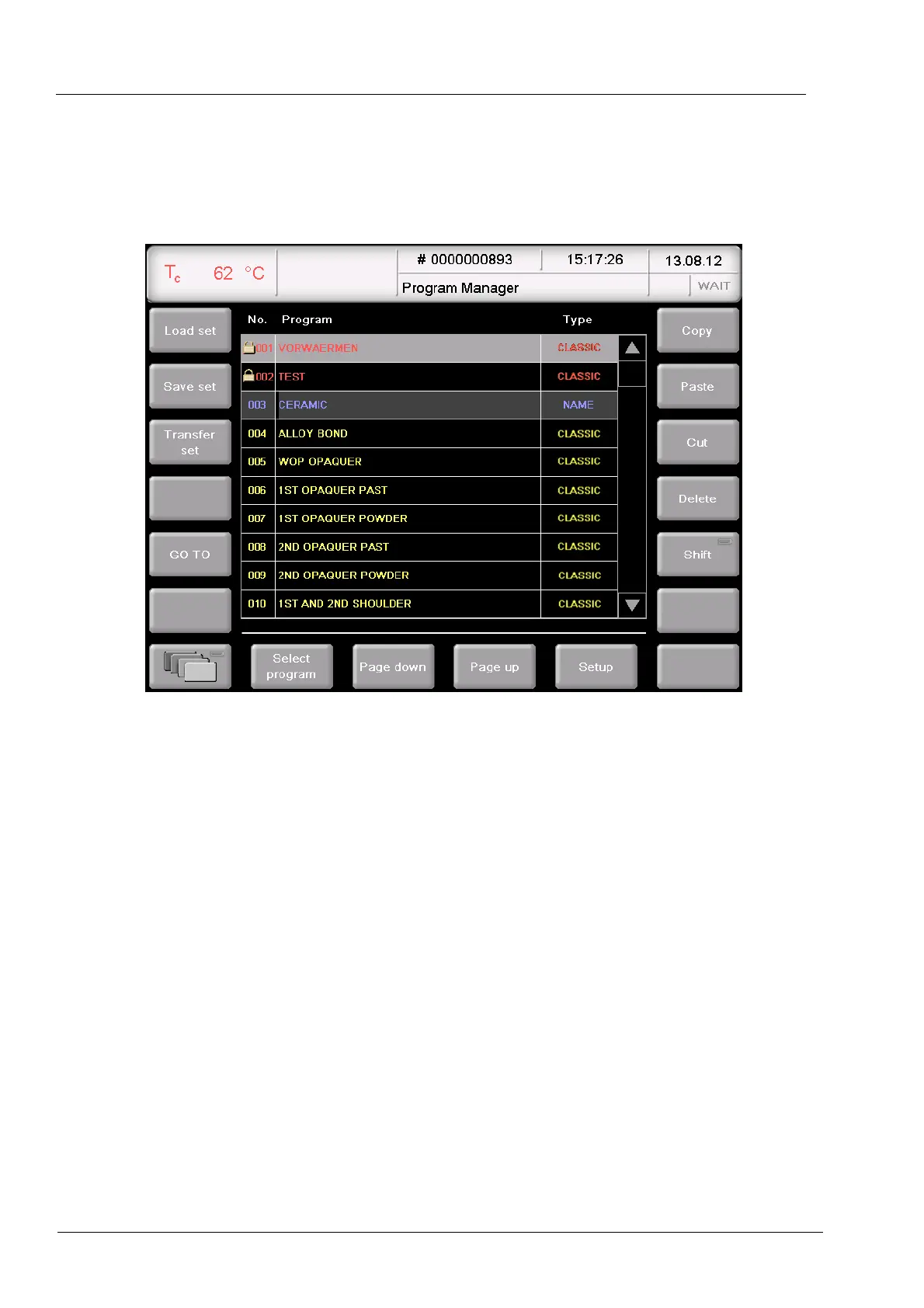 Use the Program Manager menu to select the firing programs or sets and administer the