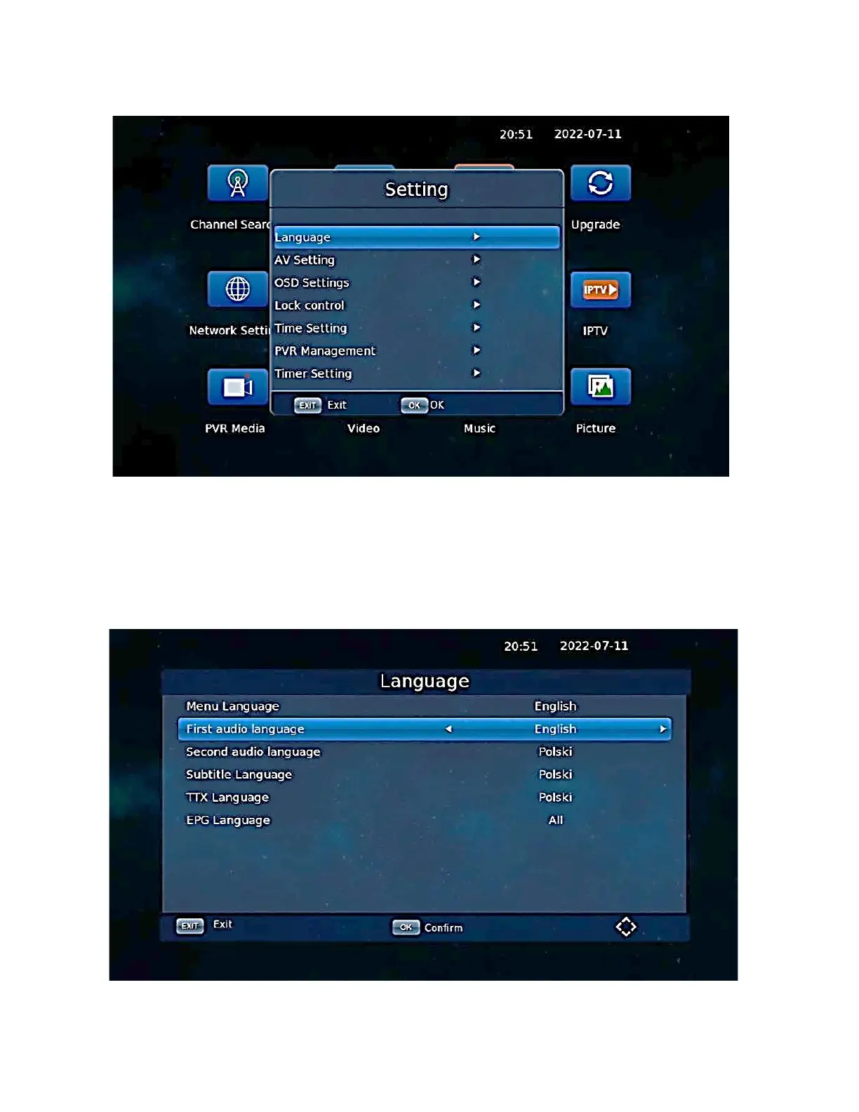 on-screen subtitles while watching, the language for the teletext and the EPG.