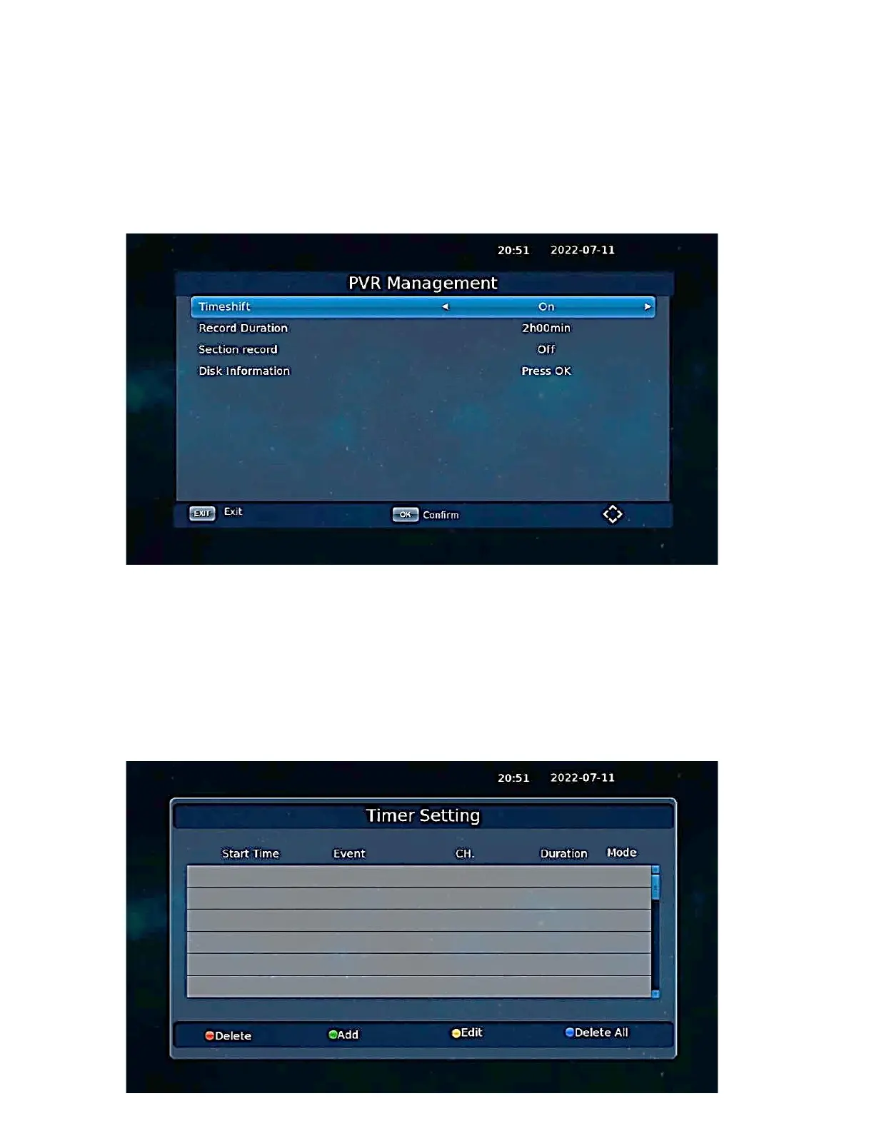 Enable or disable the TIMESHIFT function for recording live programs. The TIMESHIFT function is