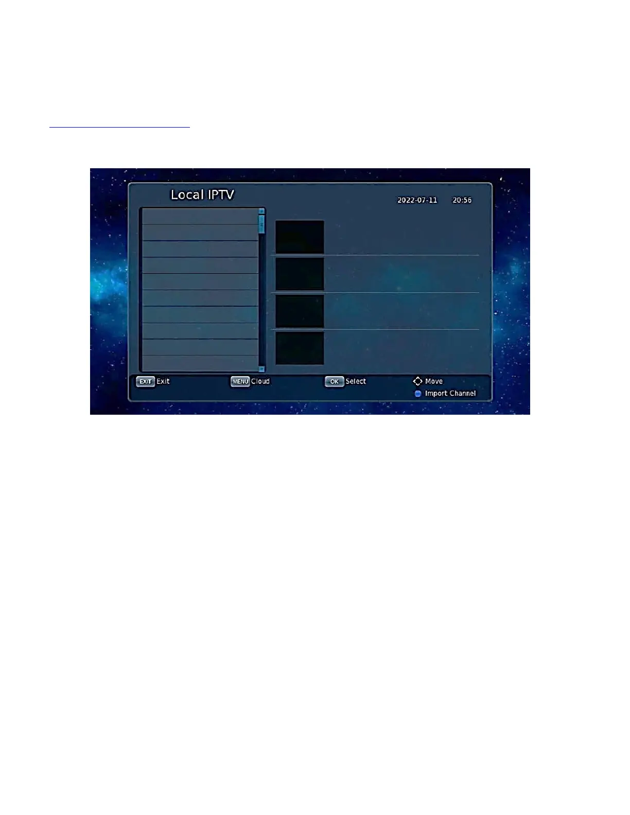 In local IPTV mode, first navigate to the XML file for IPTV and press [BLUE] then select the location