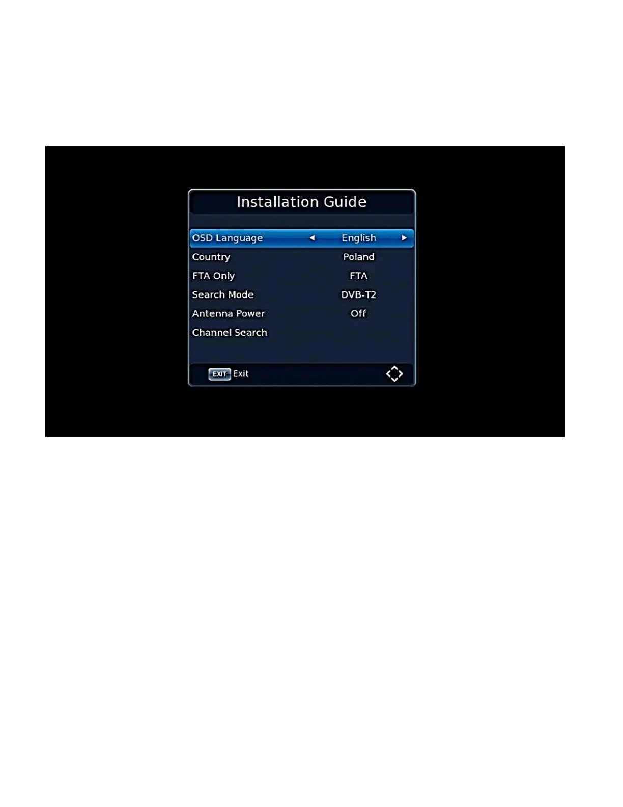 By default, when there is no TV or radio channels, tuner displays installation start screen. Press the