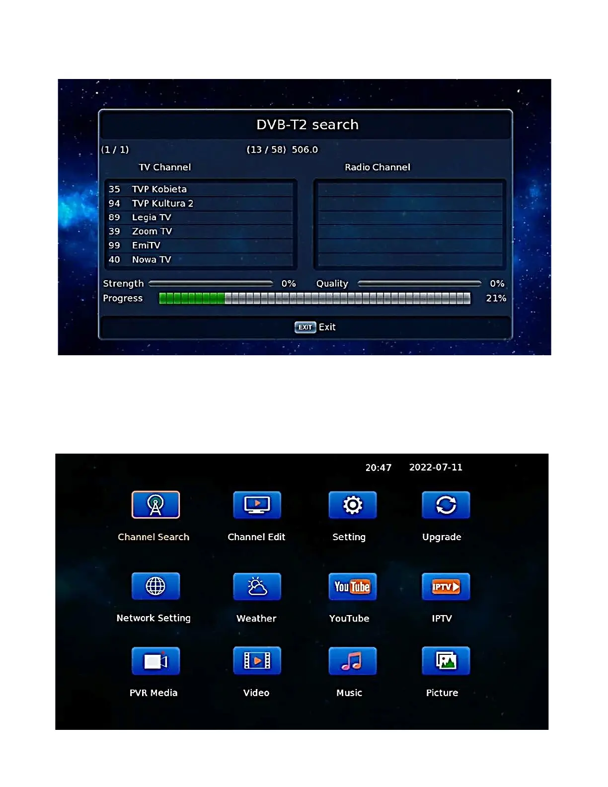 Automatic search for free DVB-T2 HEVC terrestrial TV channels will start.