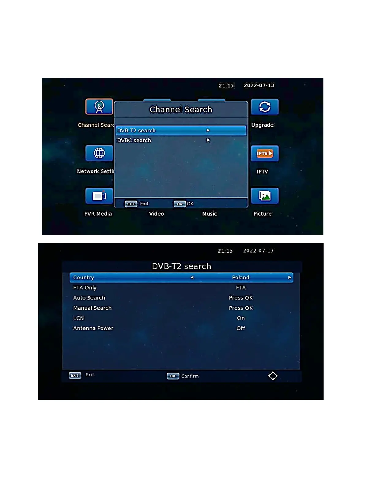 The default search settings will search for all available DVB-T2 HEVC digital terrestrial TV channels.