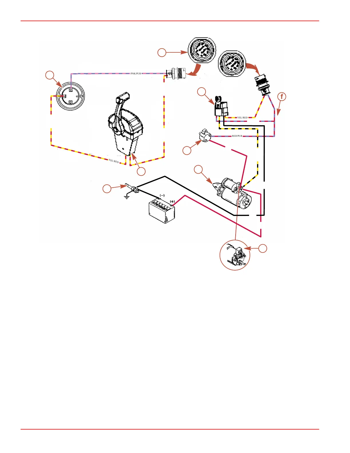 • Battery to the solenoid switch on the starter (RED battery cable).