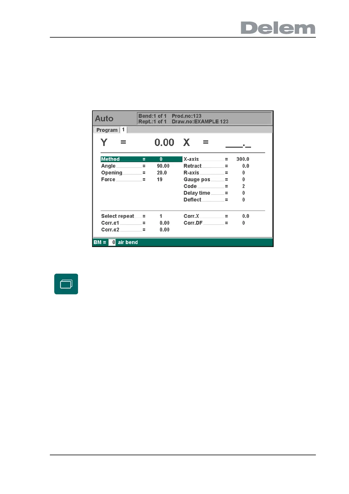 The parameters of one bend are divided over 2 screen pages. The bend number, product
