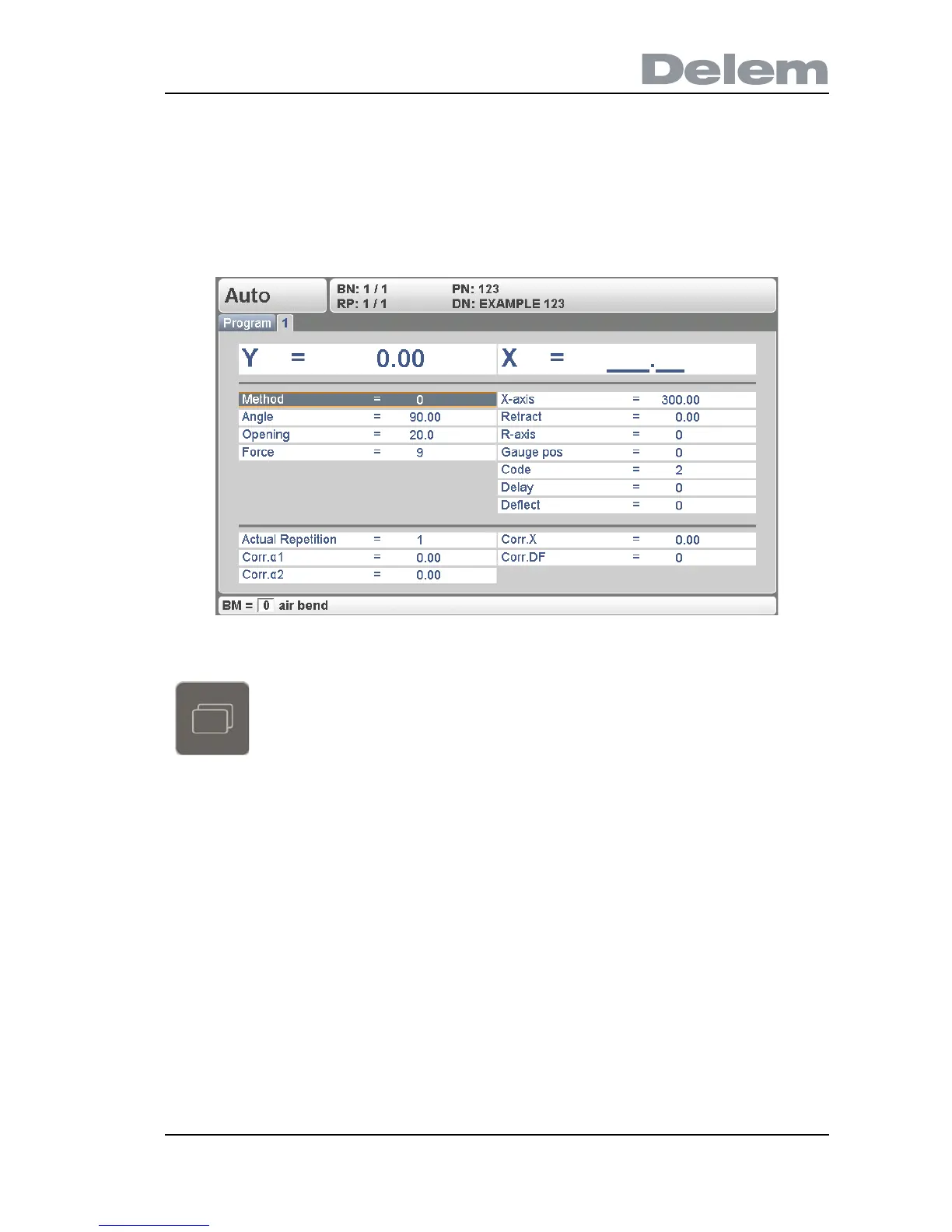 The parameters of one bend are divided over 2 screen pages. The bend number, product