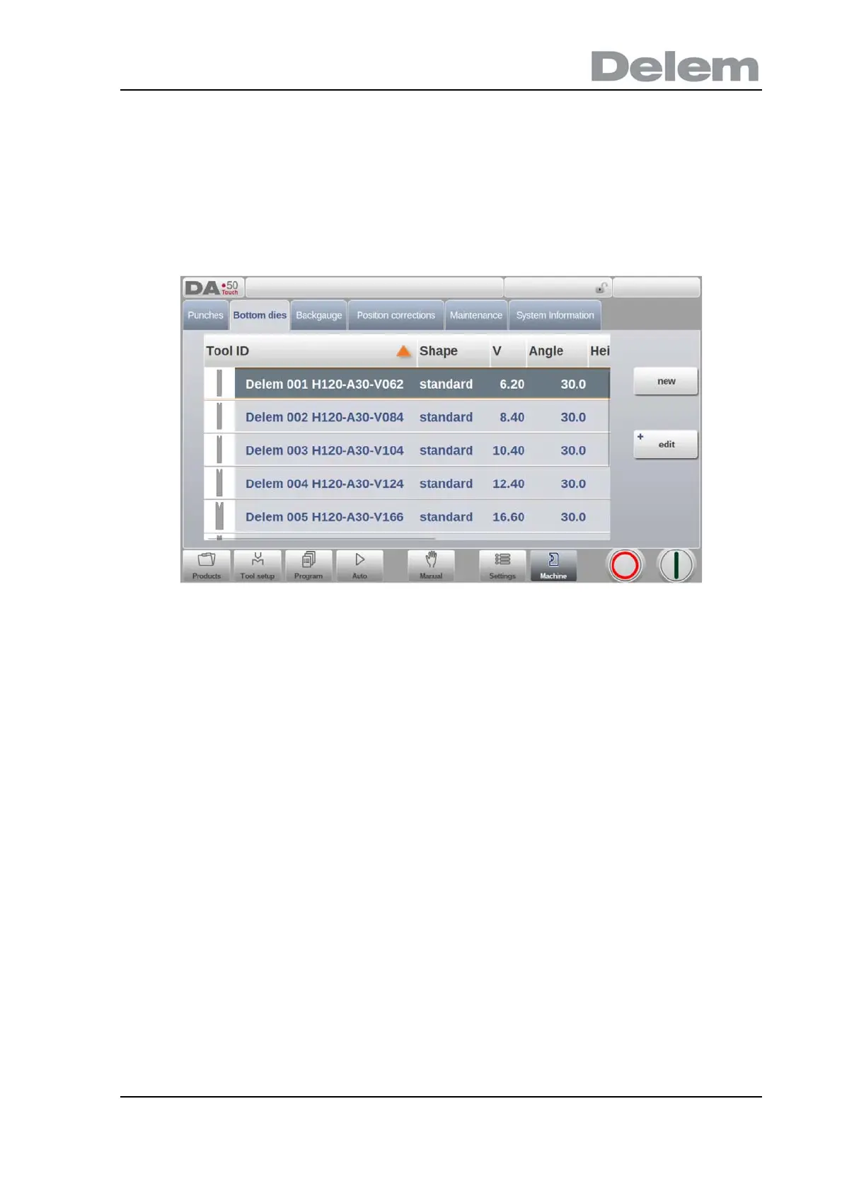 In this tab, the bottom dies used in the machine can be programmed. New dies can be added;