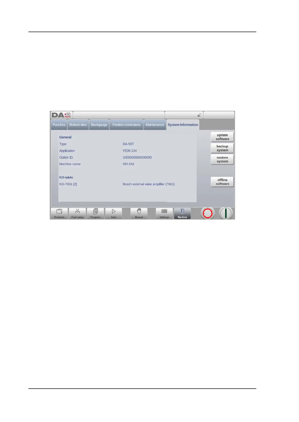 This screen shows detailed information about the control system. This information is useful for