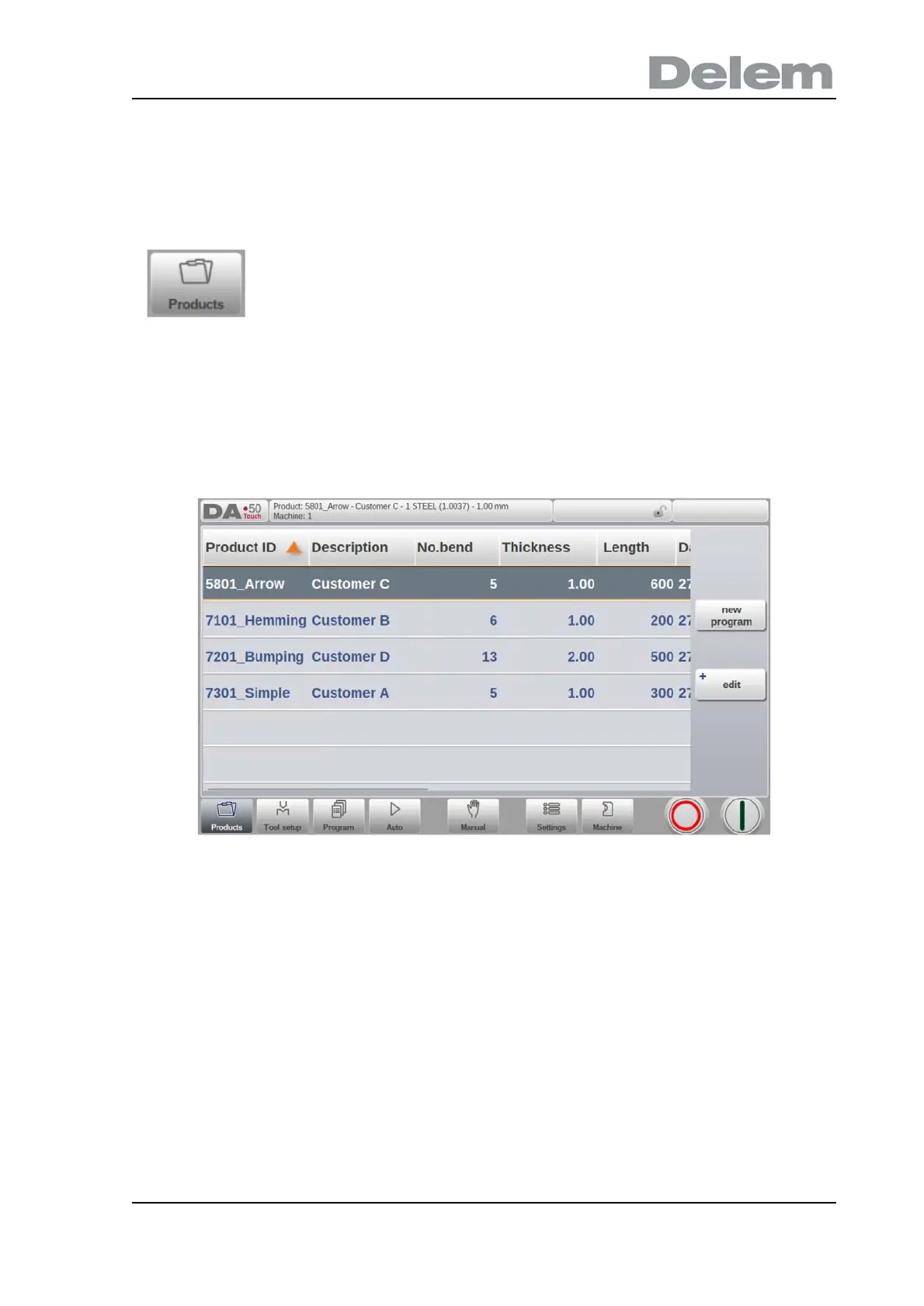 In Products mode an overview is given of the program library on the control. In this mode a