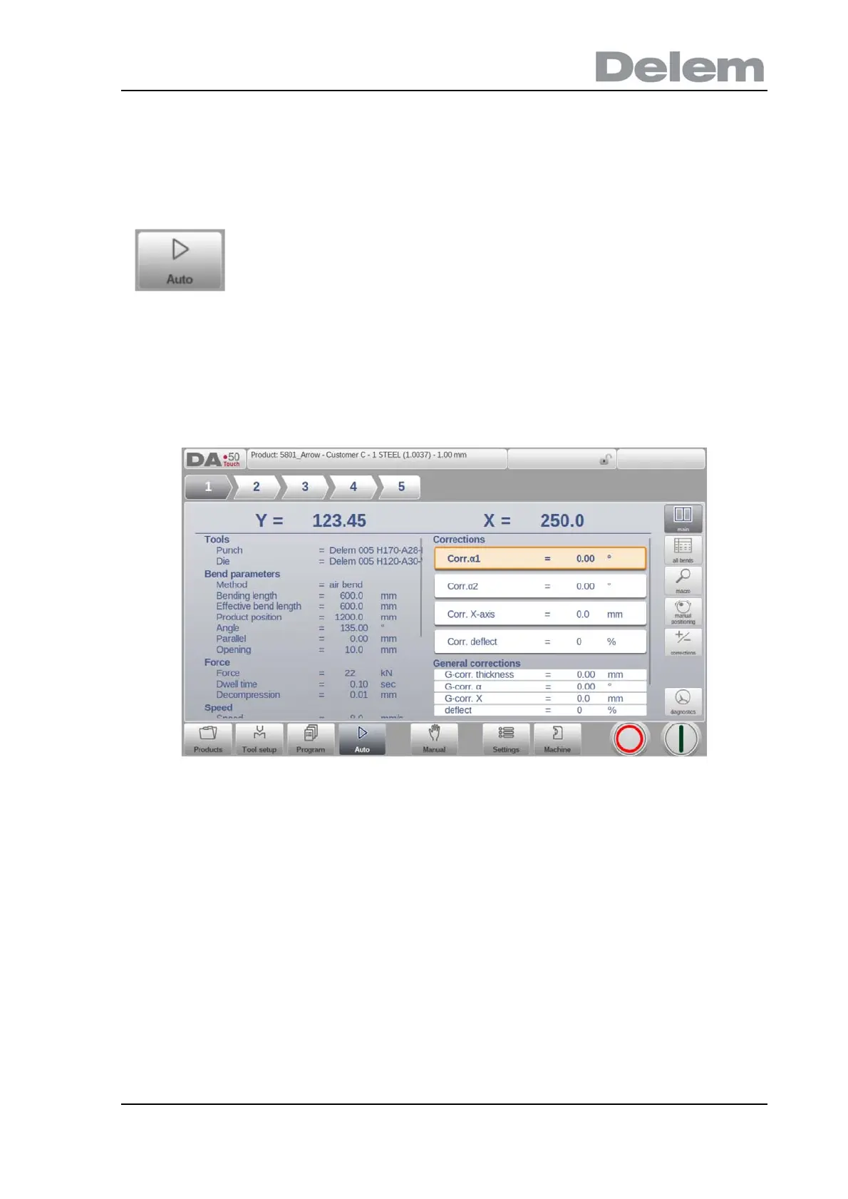 The automatic mode executes the program automatically bend by bend after pushing the Start