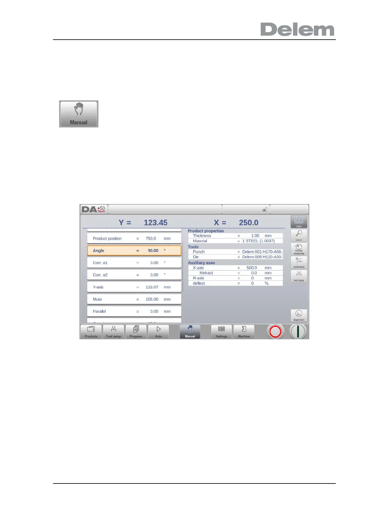 In manual mode you program the parameters for one bending. This mode is useful for testing,