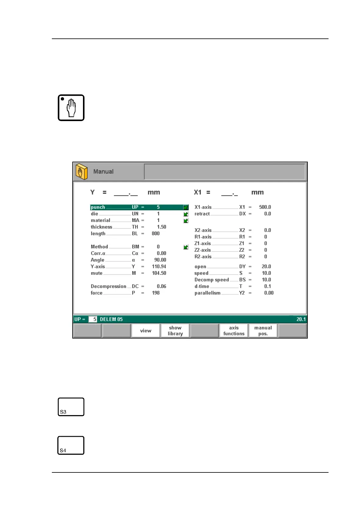 In manual mode you program the parameters for one bending. This mode is useful for testing