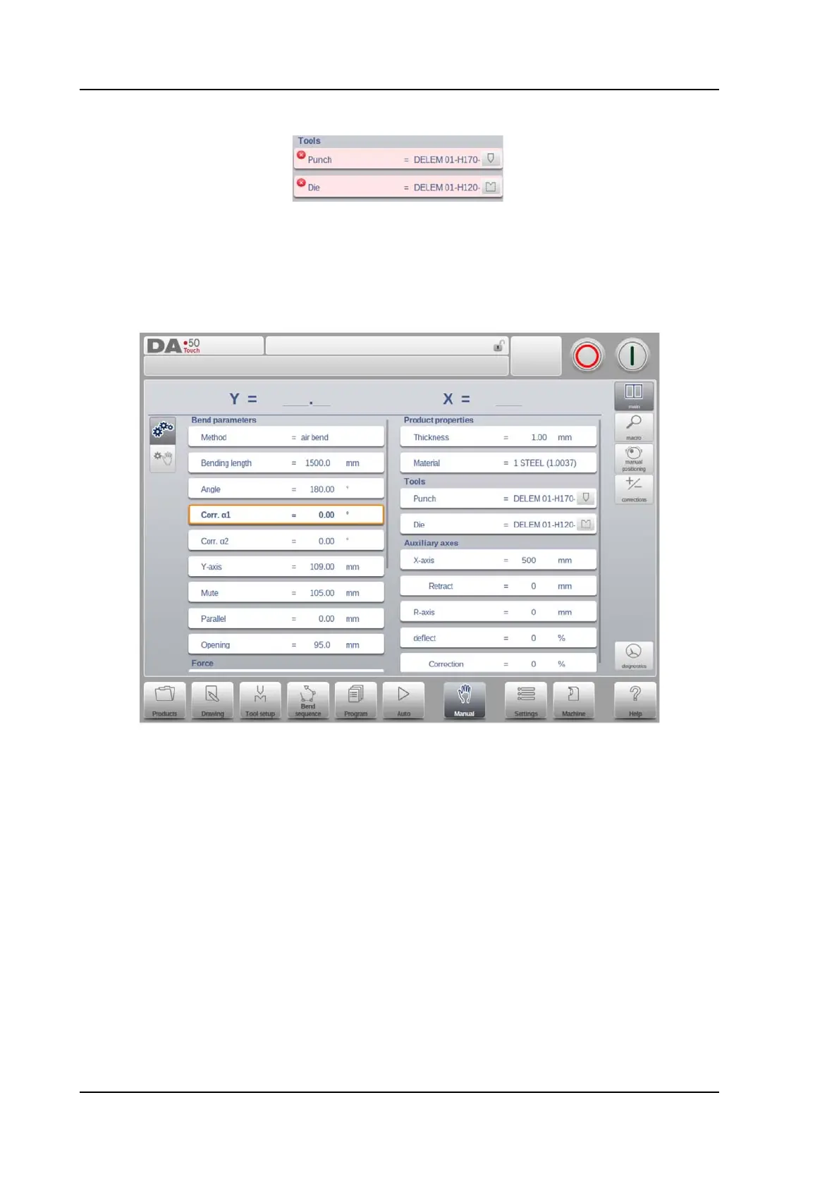 Main view, there are Macro, Manual Positioning, Corrections as also a Diagnostics view.