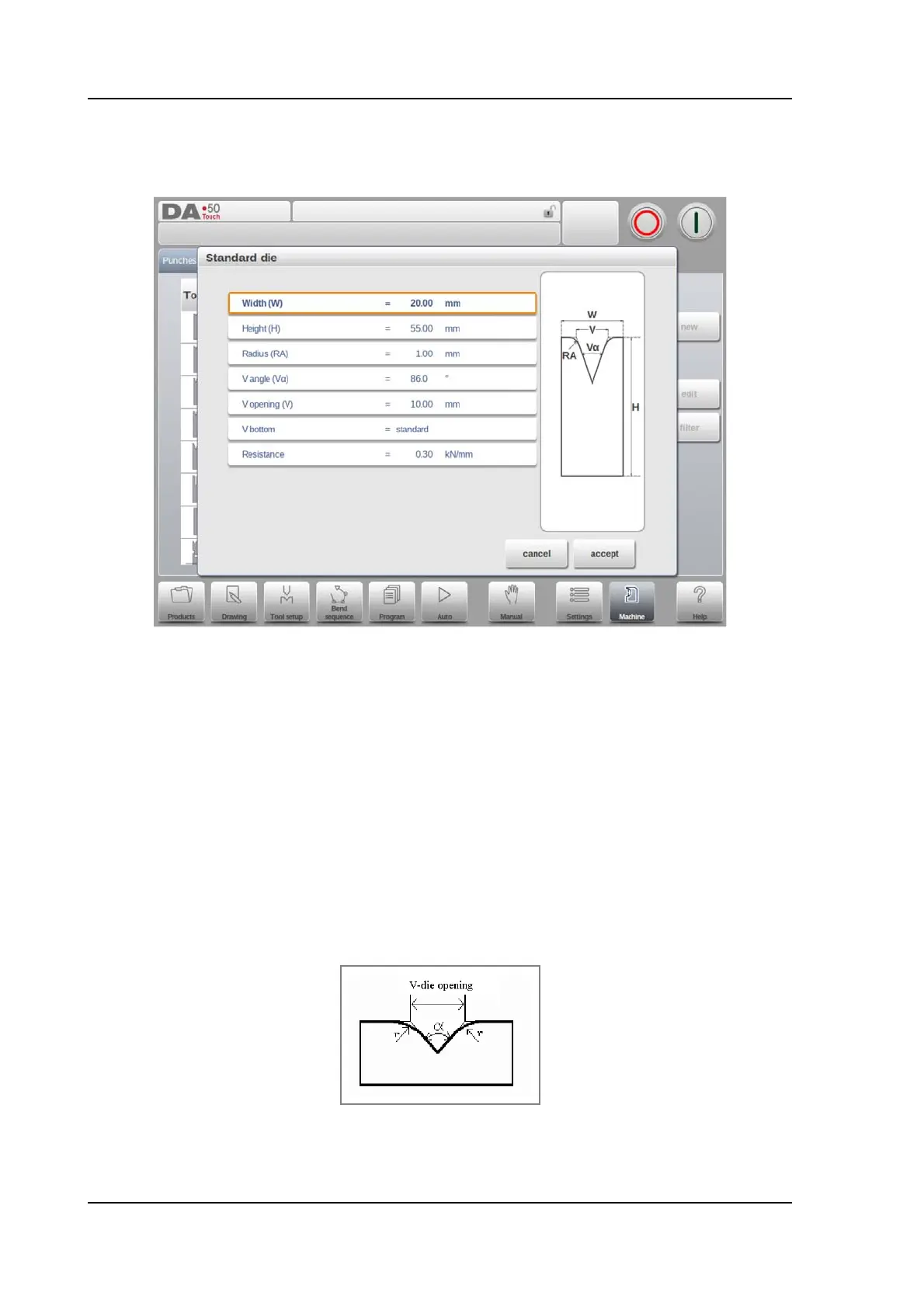 The V-opening of the die.