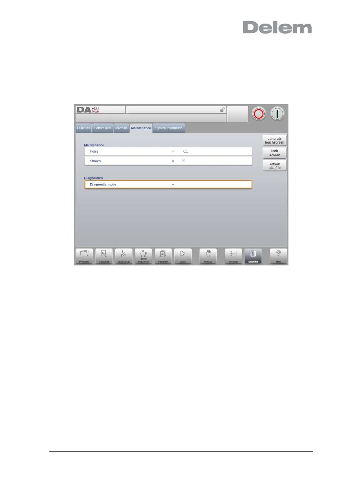 On this tab maintenance related functions are located. Next to the machine hour counter and