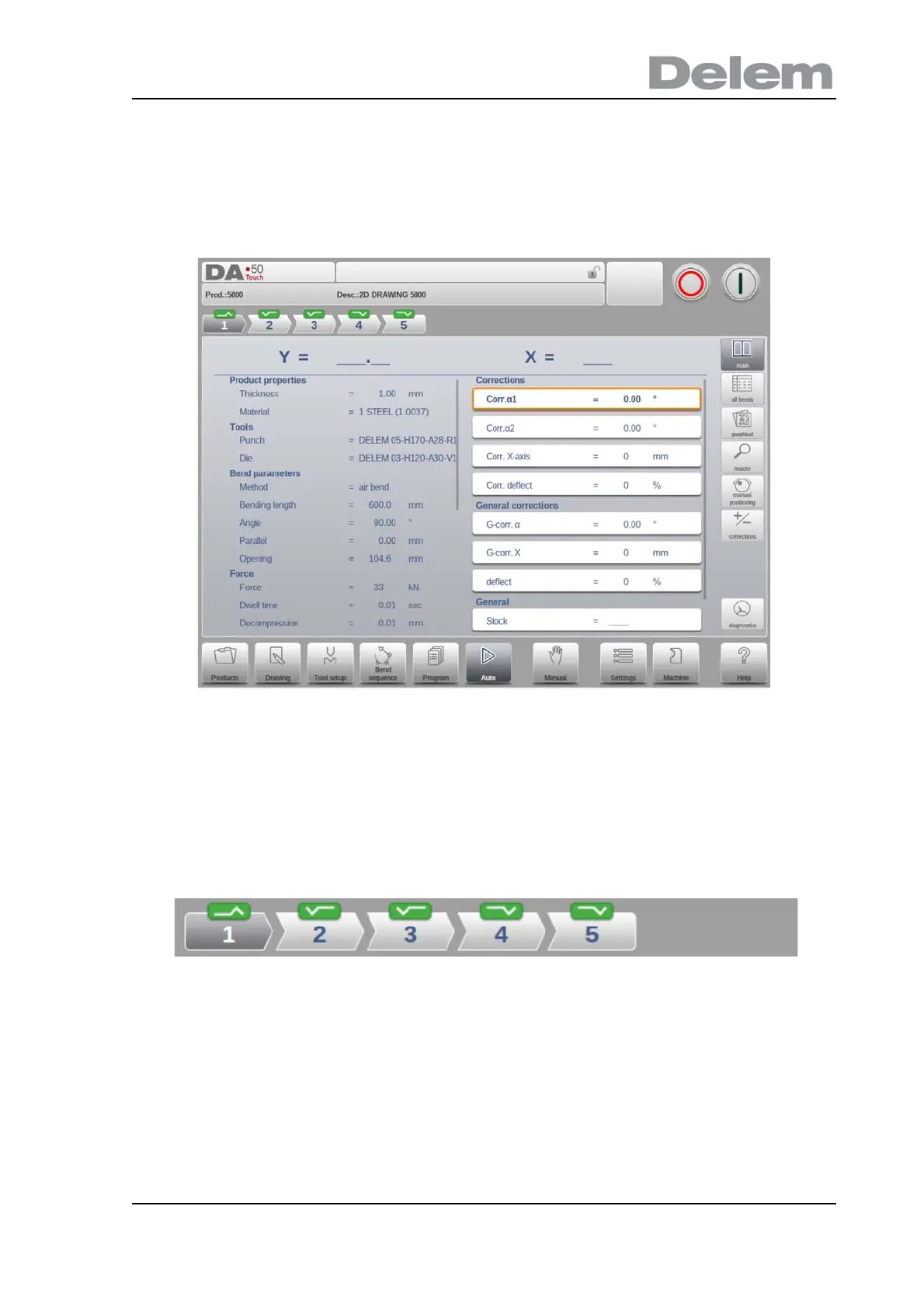 Main view shows the numerical data of the bend along with the corrections. The corrections