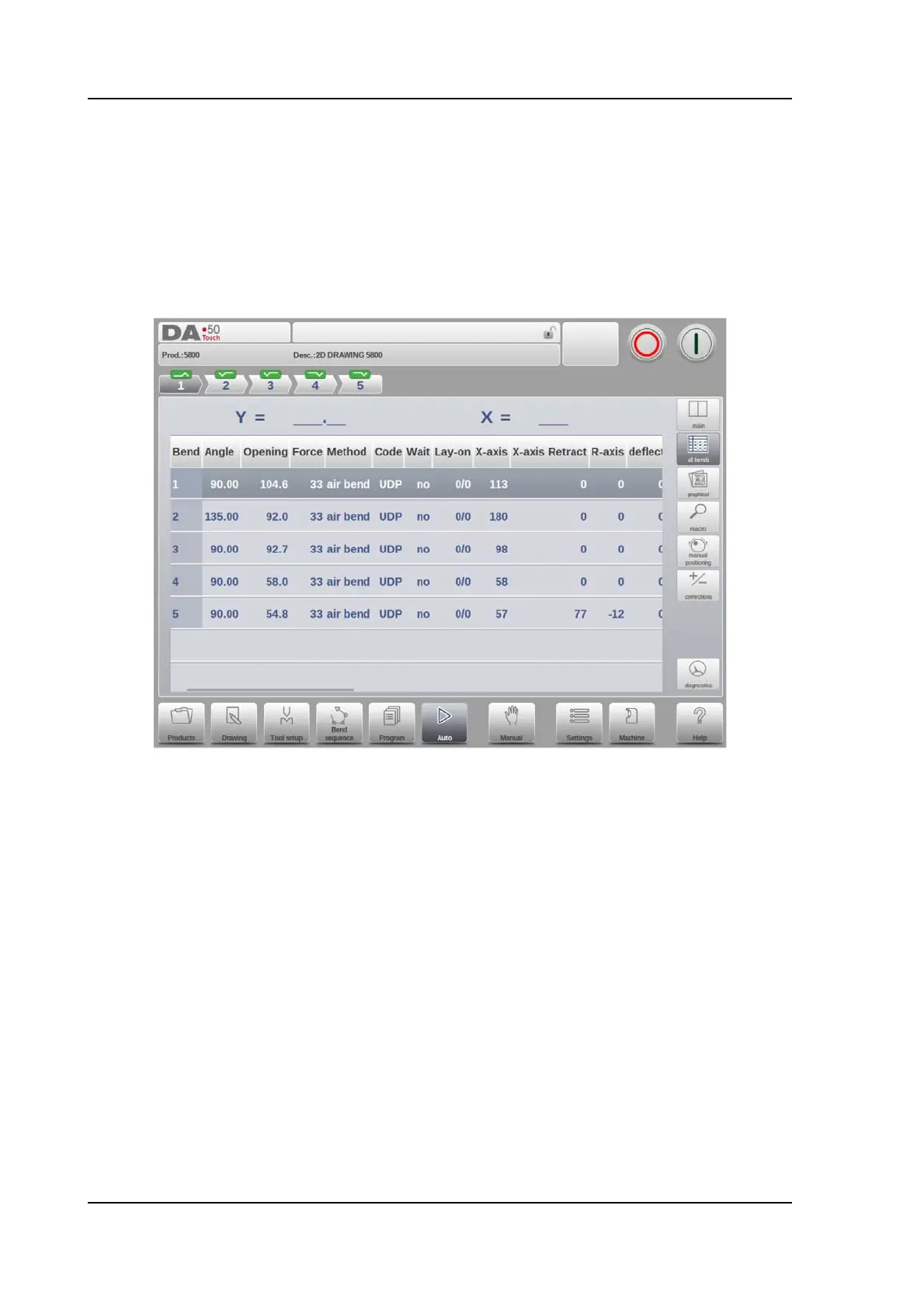 During bending the control will step through the list and corrections belonging to the selected