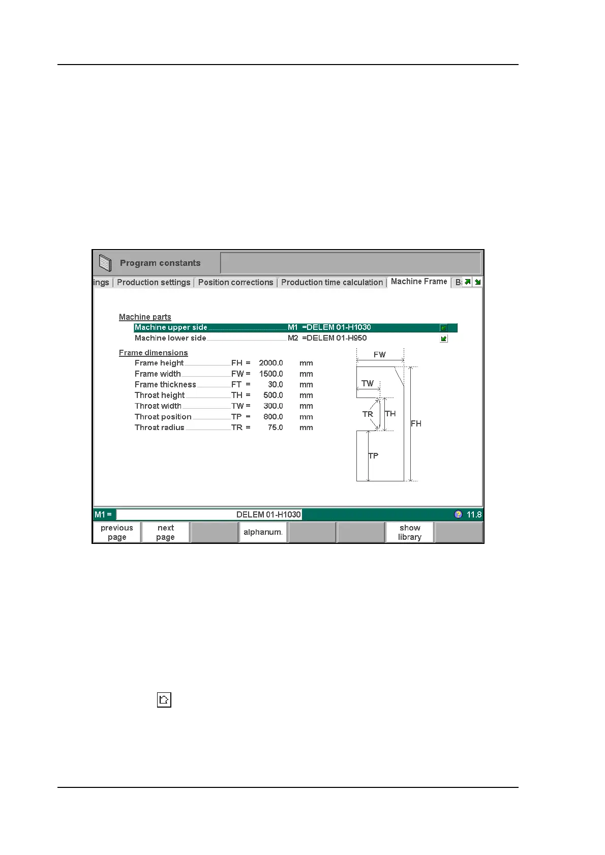 On this page the dimensions of the side frame of the machine are programmed. The