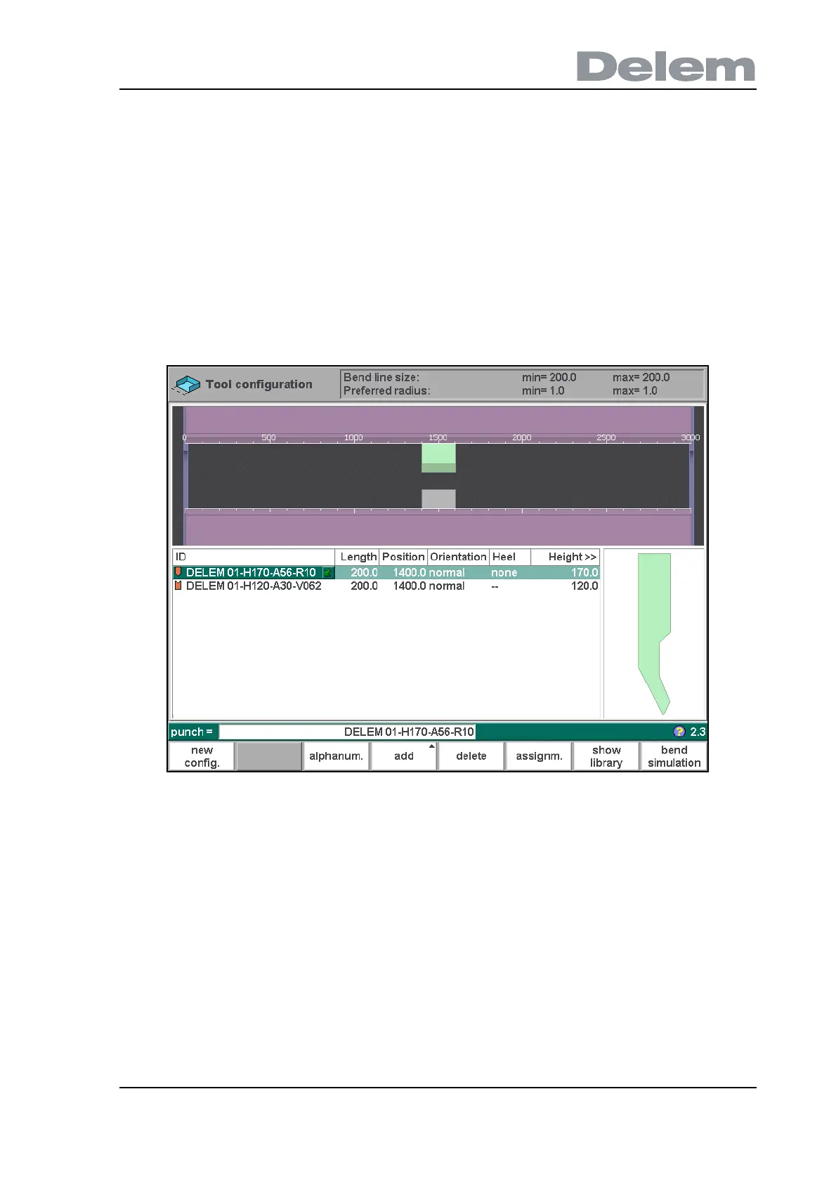 When the function ‘tool configuration’ has been activated, the screen shows a front view of the