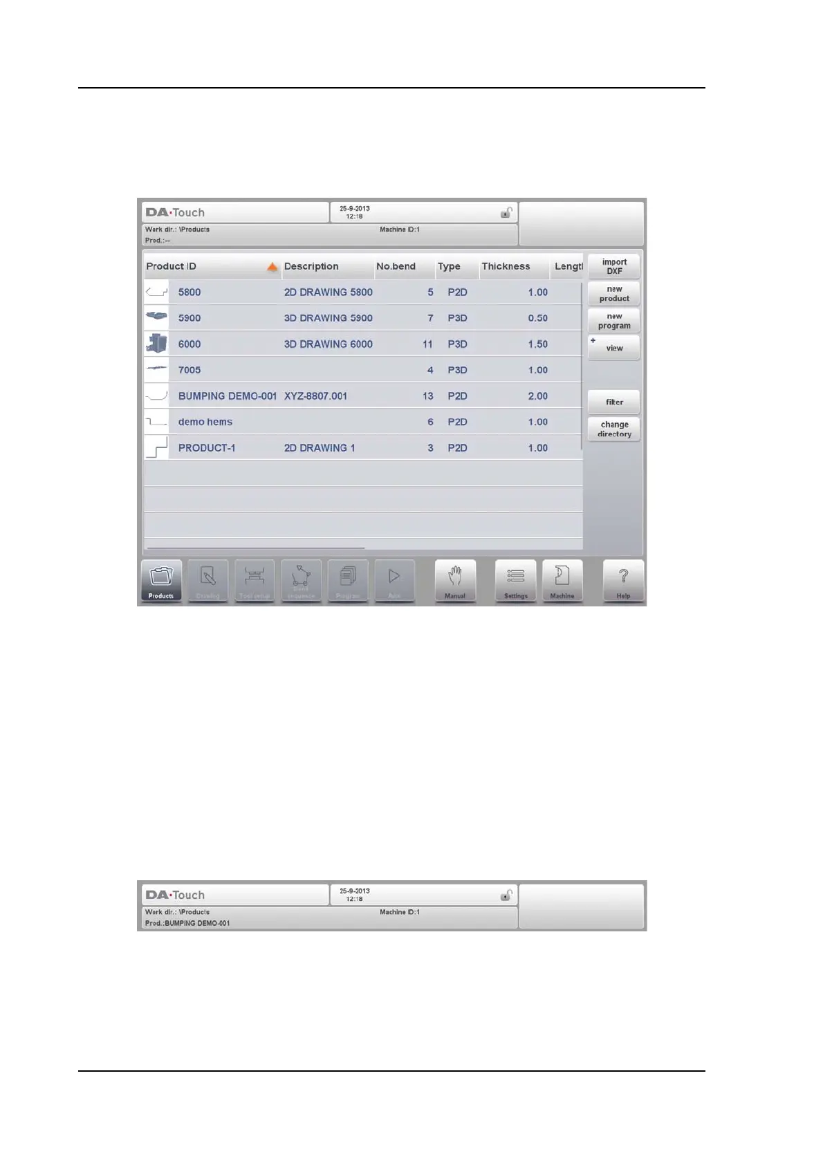 product is loaded, the active bend, selected subdirectory and (when activated) the service