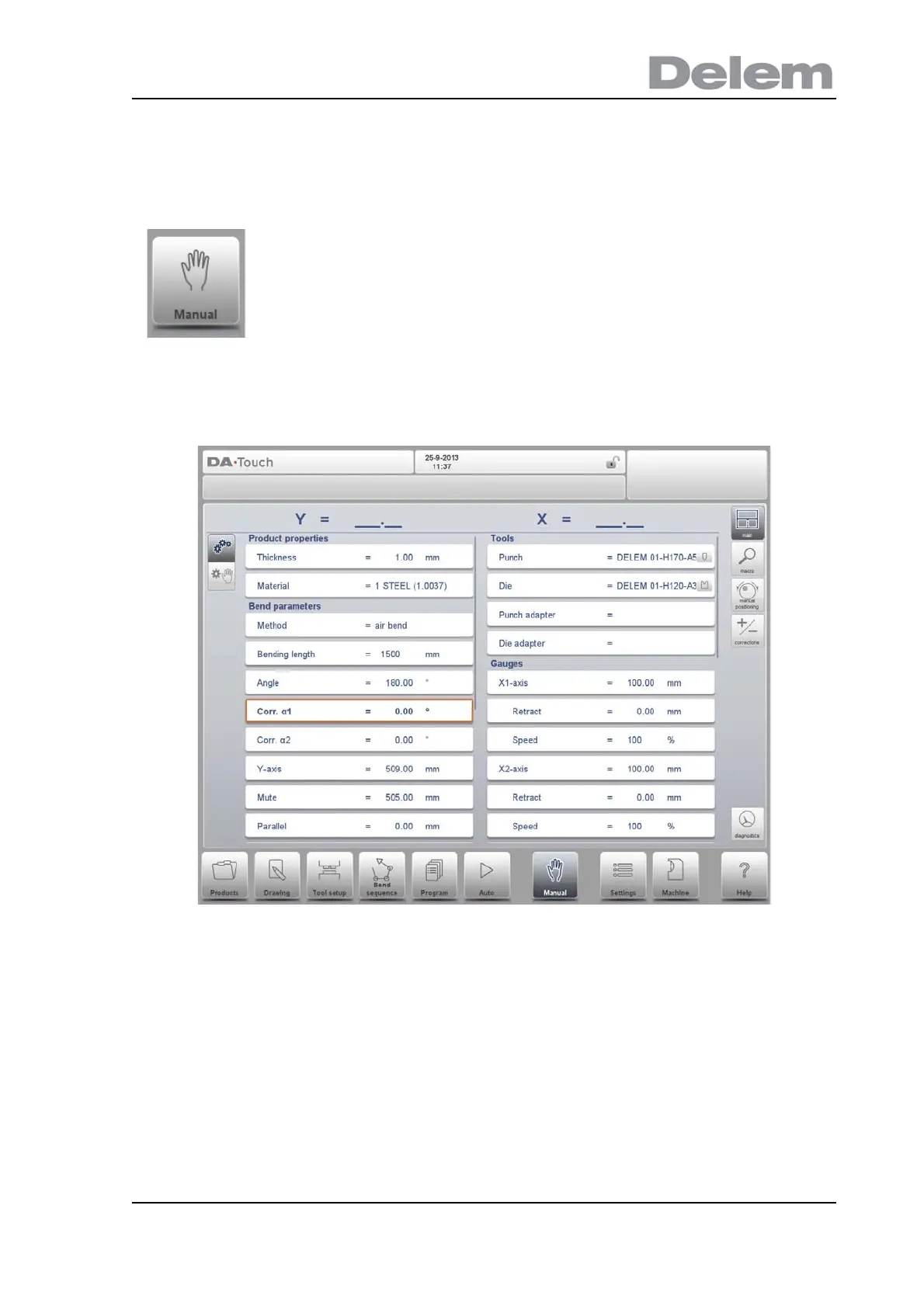 In manual mode you program the parameters for one bending. This mode is useful for testing,