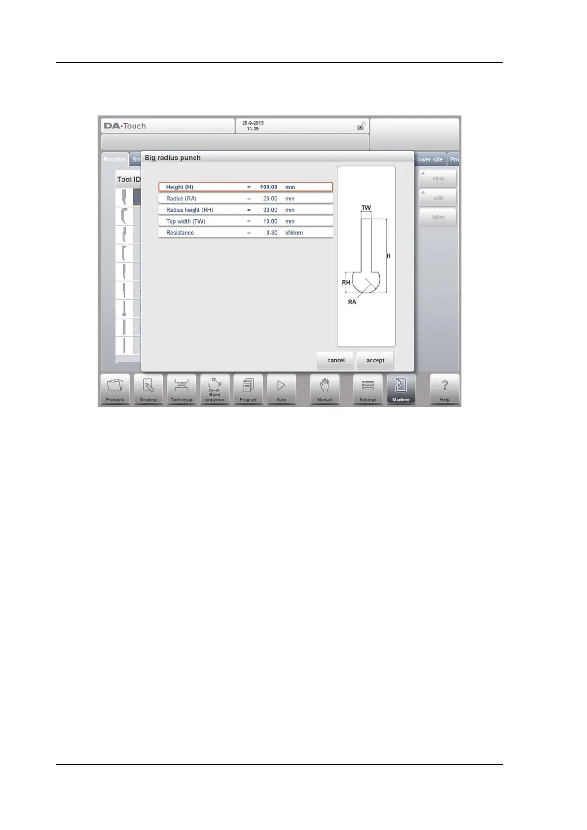 Drawing a tool profile is done by entering angle values and line length values. Also the Touch