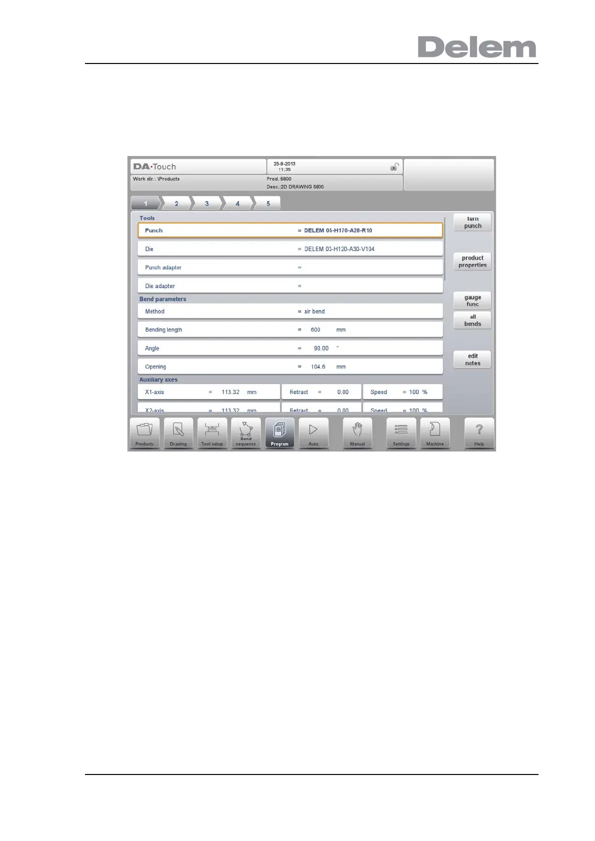 The parameters of every bend are listed on one page and can be scrolled thru. Below the