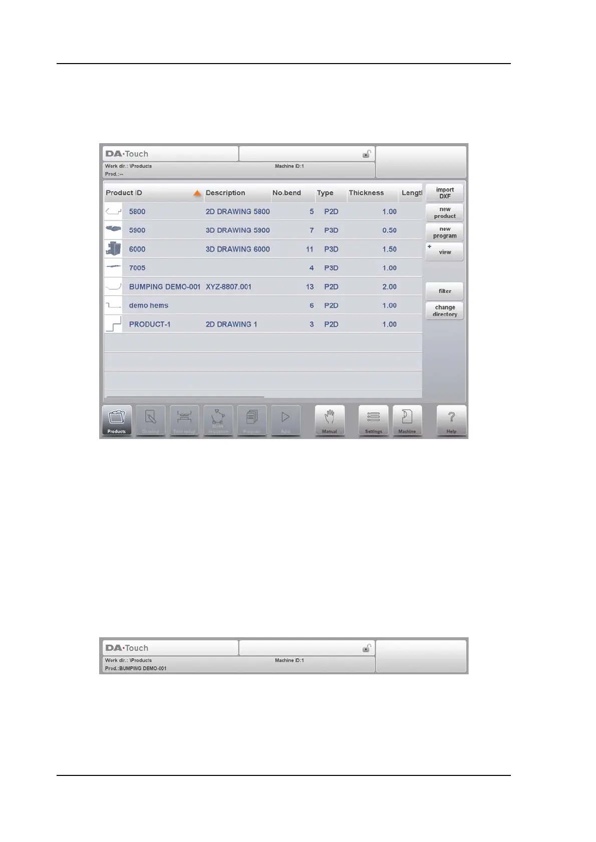 product is loaded, the active bend, selected subdirectory and (when activated) the service