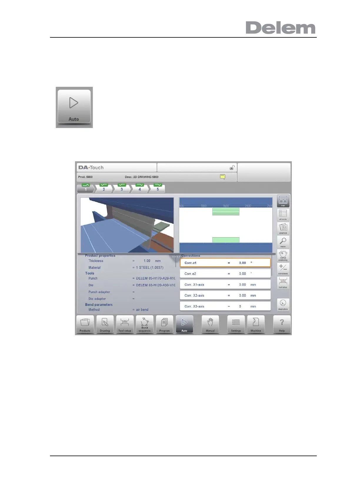 The automatic mode executes the program automatically bend by bend after pushing the Start