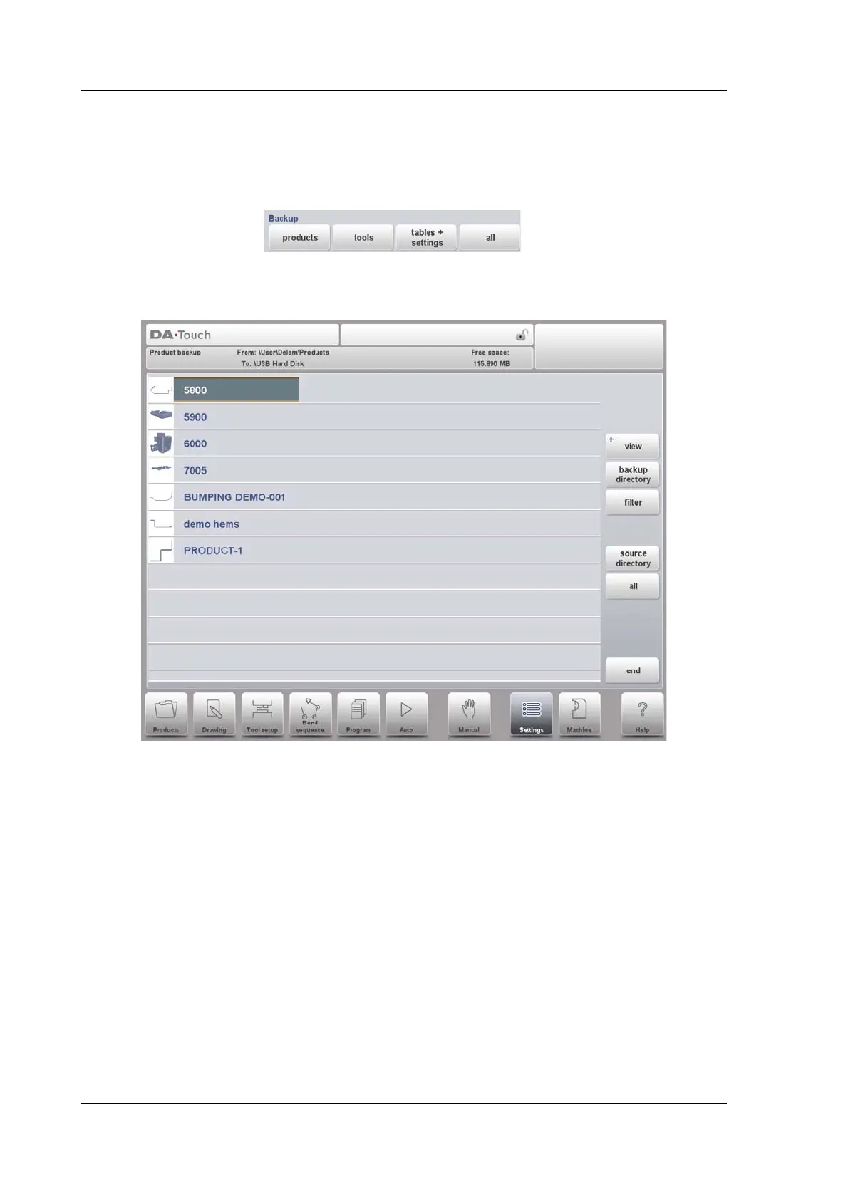 In the backup screen the products in the selected directory are shown.