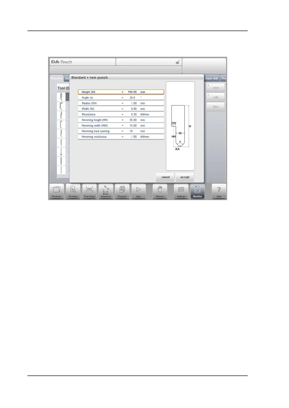 The height of the punch used to move down in case of the hemming function.