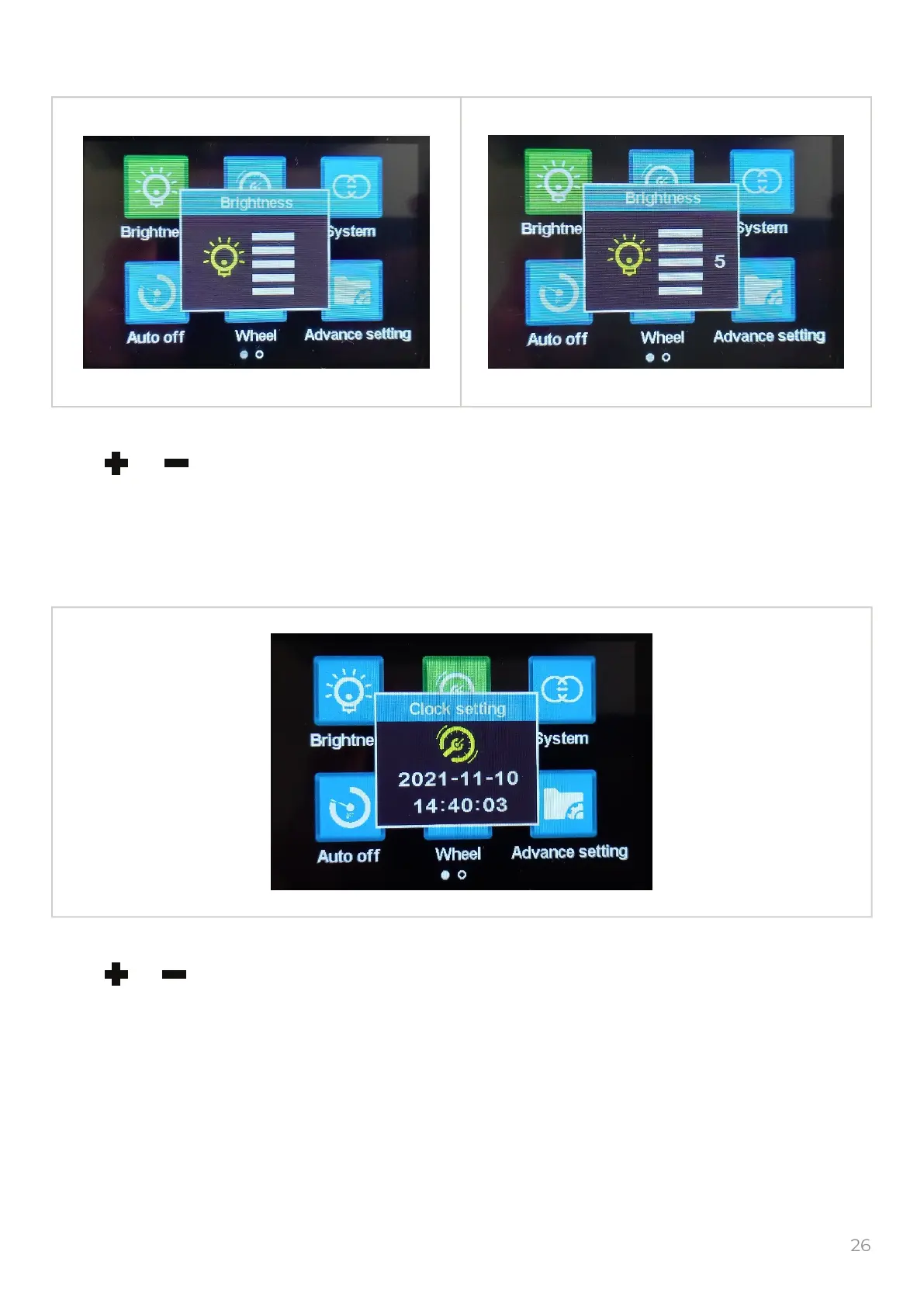 Select the “Brightness” icon and push the to get into the brightness adjusting settings.