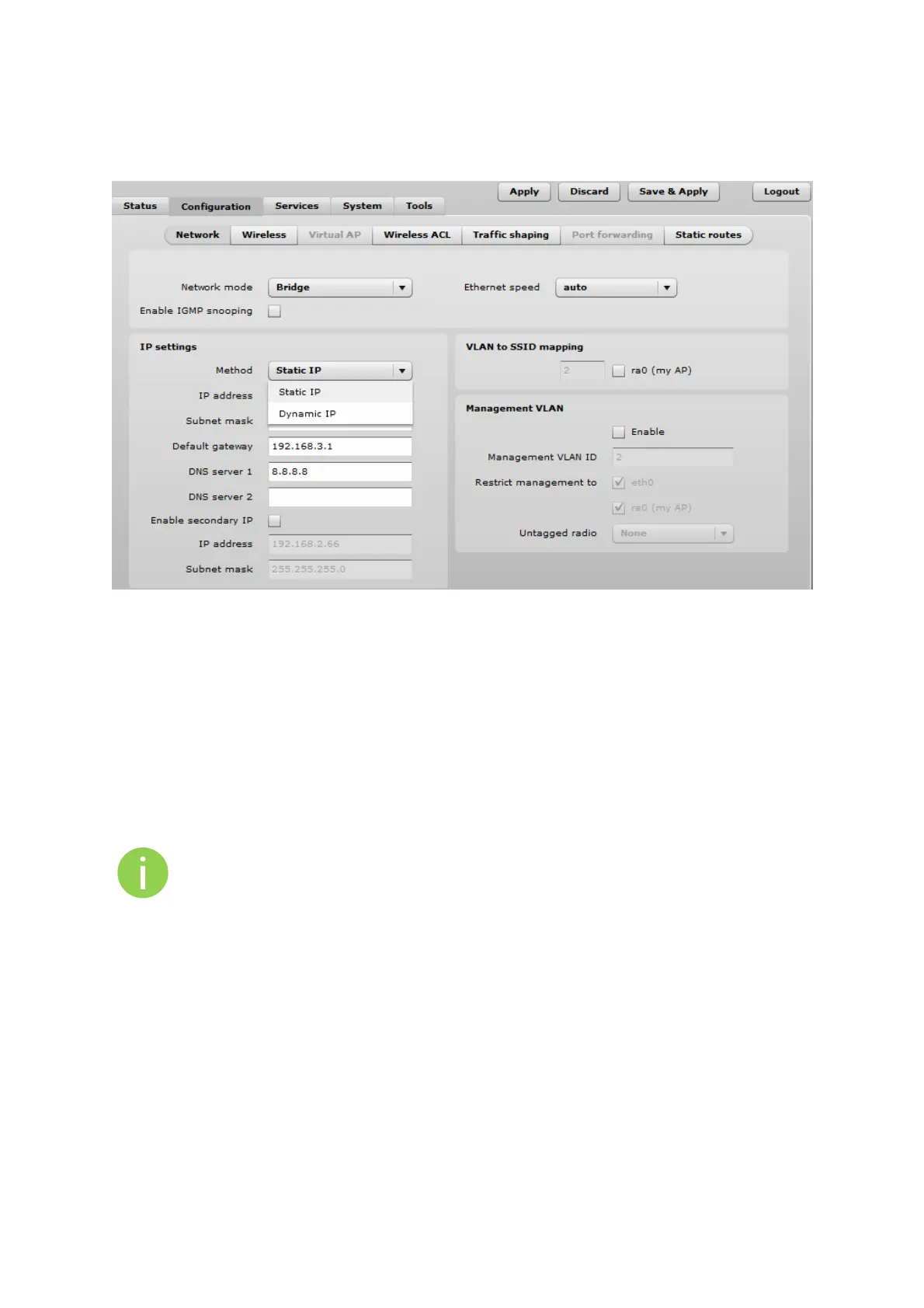 to the same IP subnet as your wired LAN, otherwise you will lose the connection to the