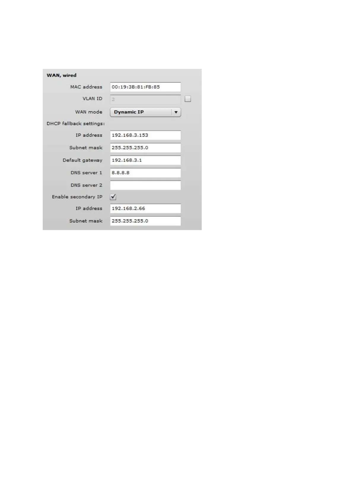 DHCP fallback setting – specify IP address, Subnet mask, Default gateway and optionally DNS