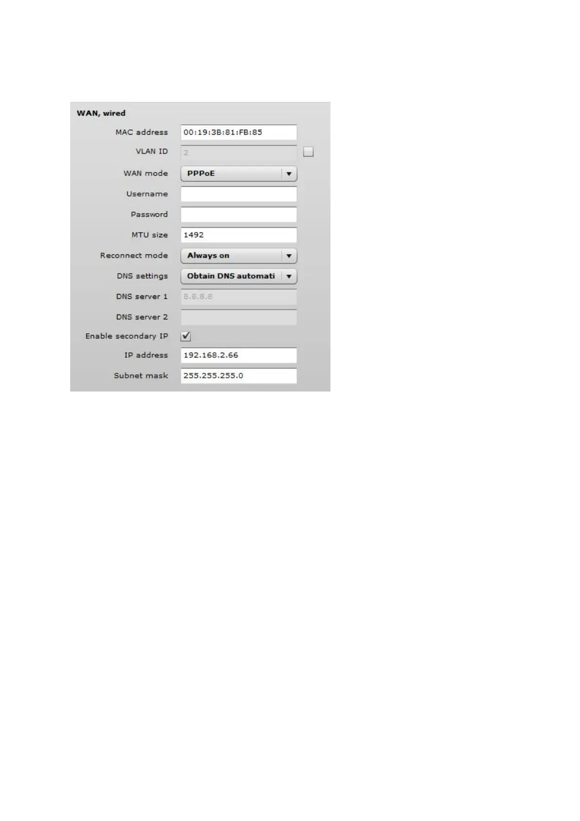 WAN mode – choose PPPoE to configure WAN interface to connect to an ISP via a PPPoE: