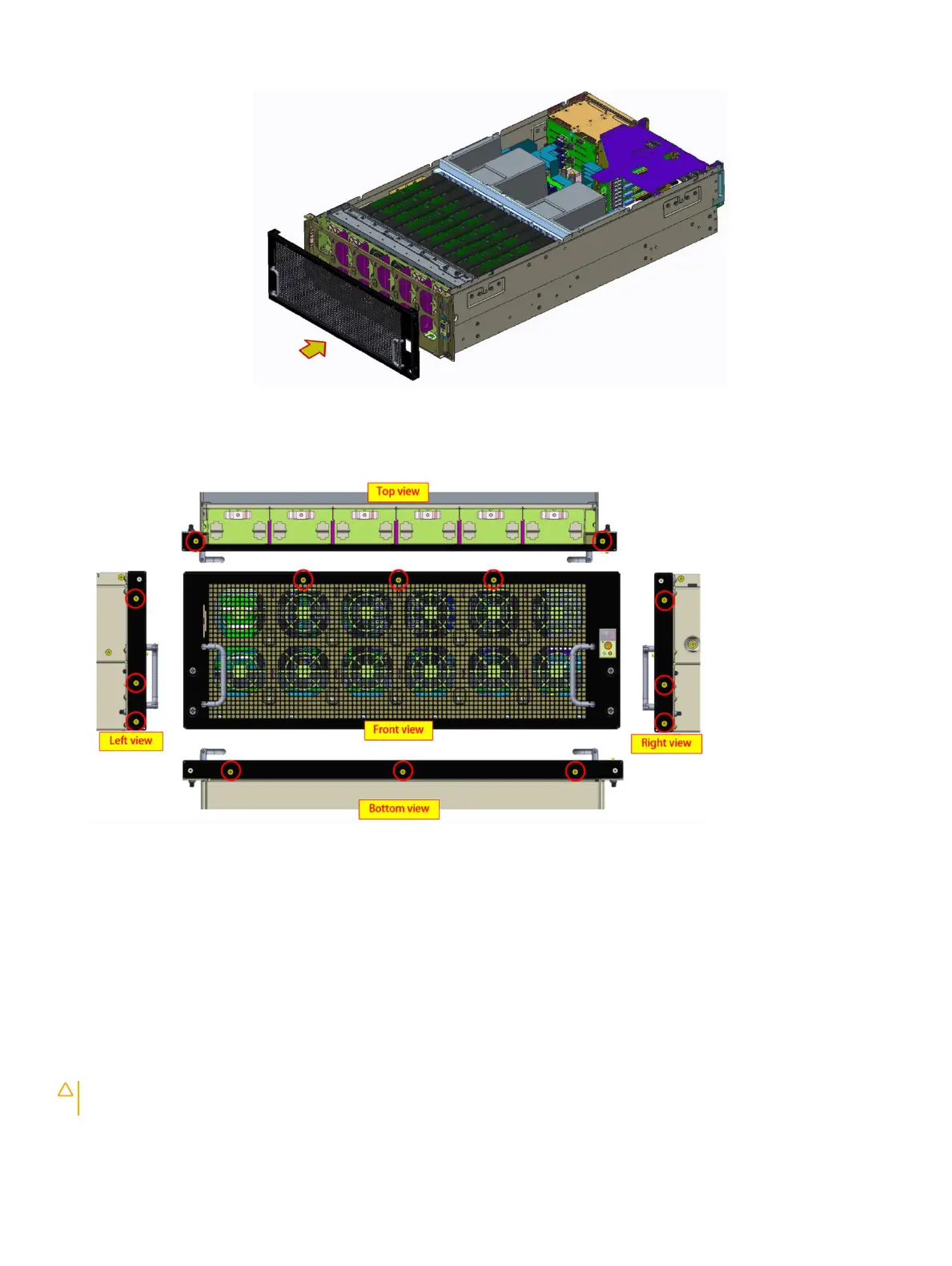 2 Tighten the screws to secure the front bezel to the fan cage.