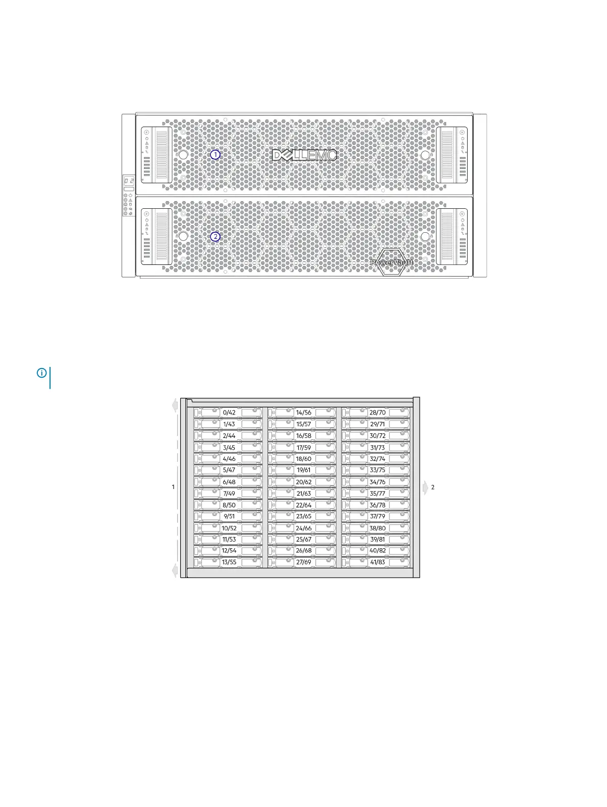 1 5U84 enclosure drawer (slot 0 = top drawer) 2 5U84 enclosure drawer (slot 1 = bottom drawer)