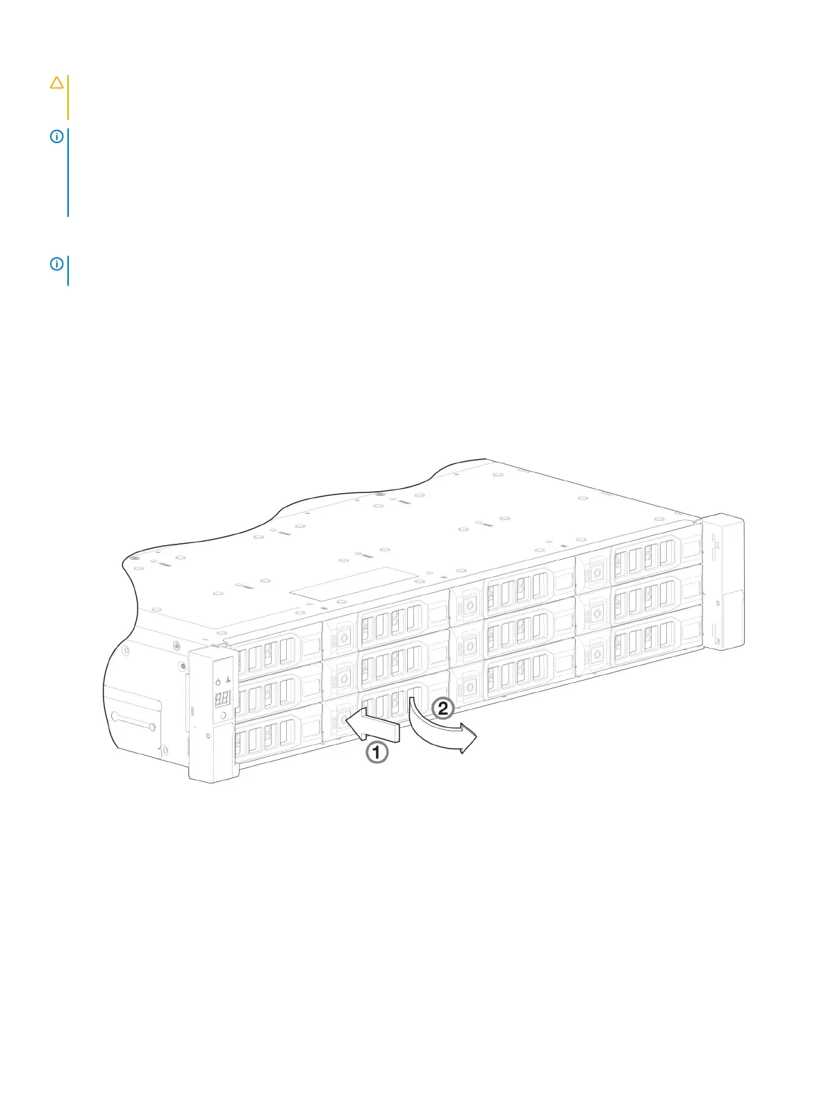CAUTION: Removing a disk drive module impacts the airow and cooling ability of the enclosure. If the internal temperature