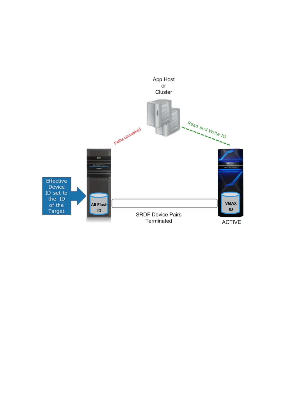 visible to a host because the masking has been removed. The source device IDs have also been permanently swapped with the target