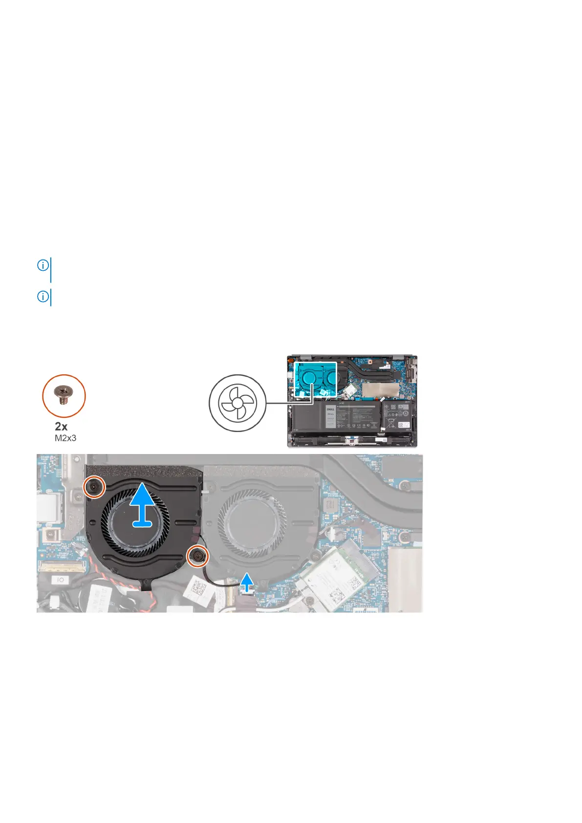 1. Remove the two screws (M2x3) that secure the left fan to the palm-rest and keyboard assembly.
