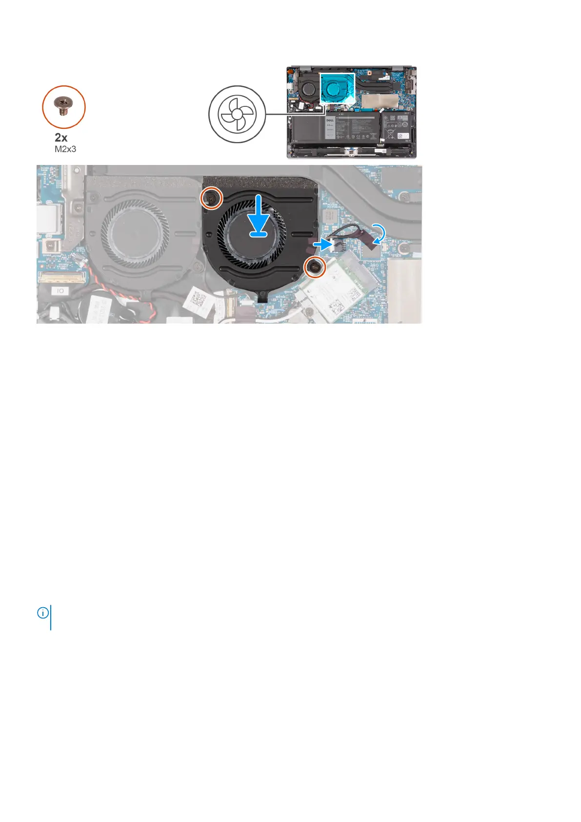 3. Replace the two screws (M2x3) that secure the right fan to the palm-rest and keyboard assembly.