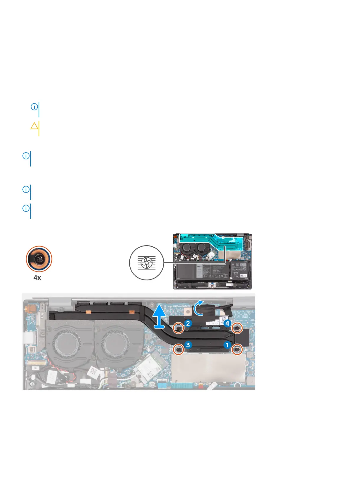 1. In reverse sequential order (4>3>2>1), loosen the four captive screws (M2x6) that secure the heat sink to the system board.
