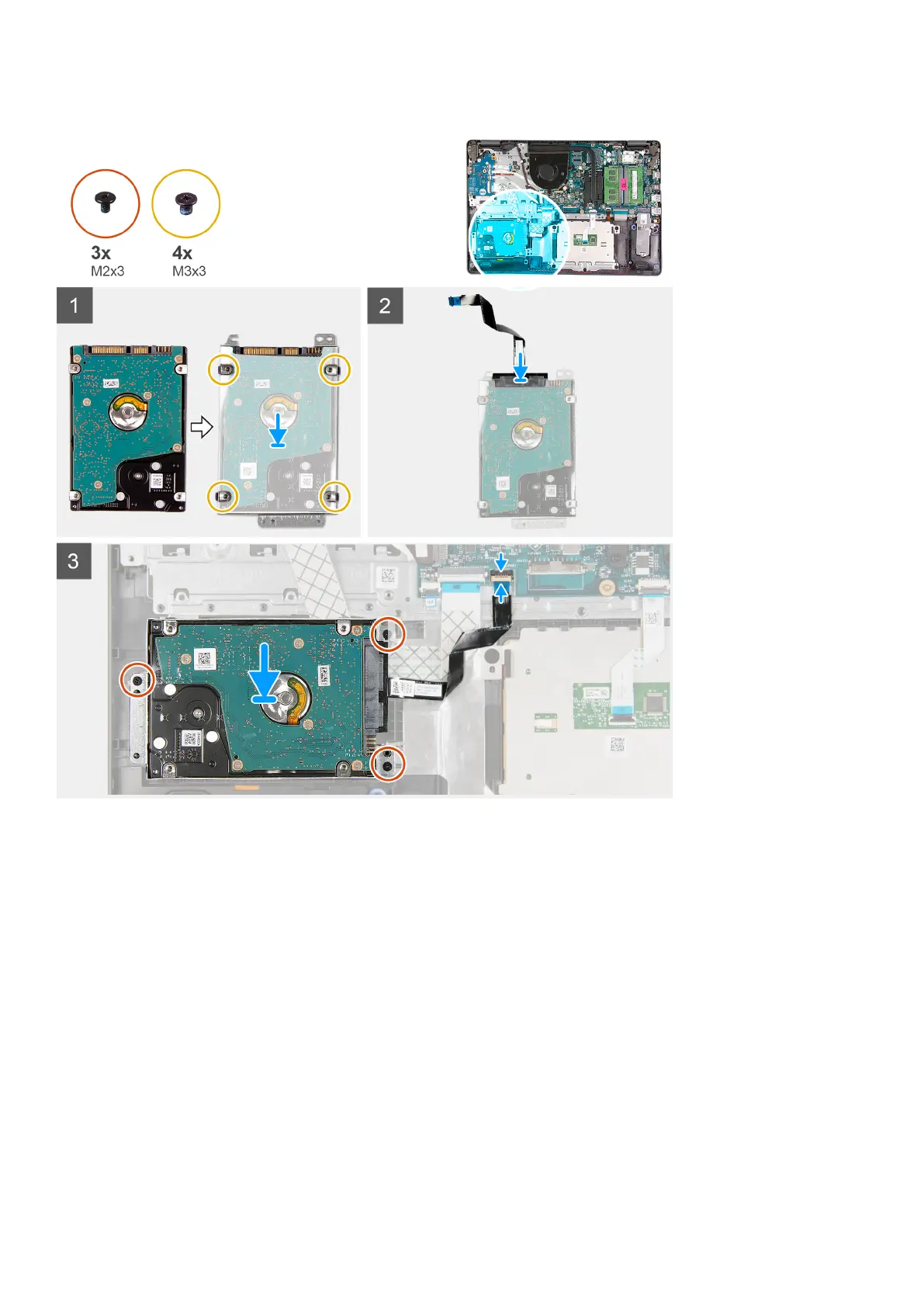 1. Align the hard drive with the hard drive bracket and replace the four (M3x3) screws.