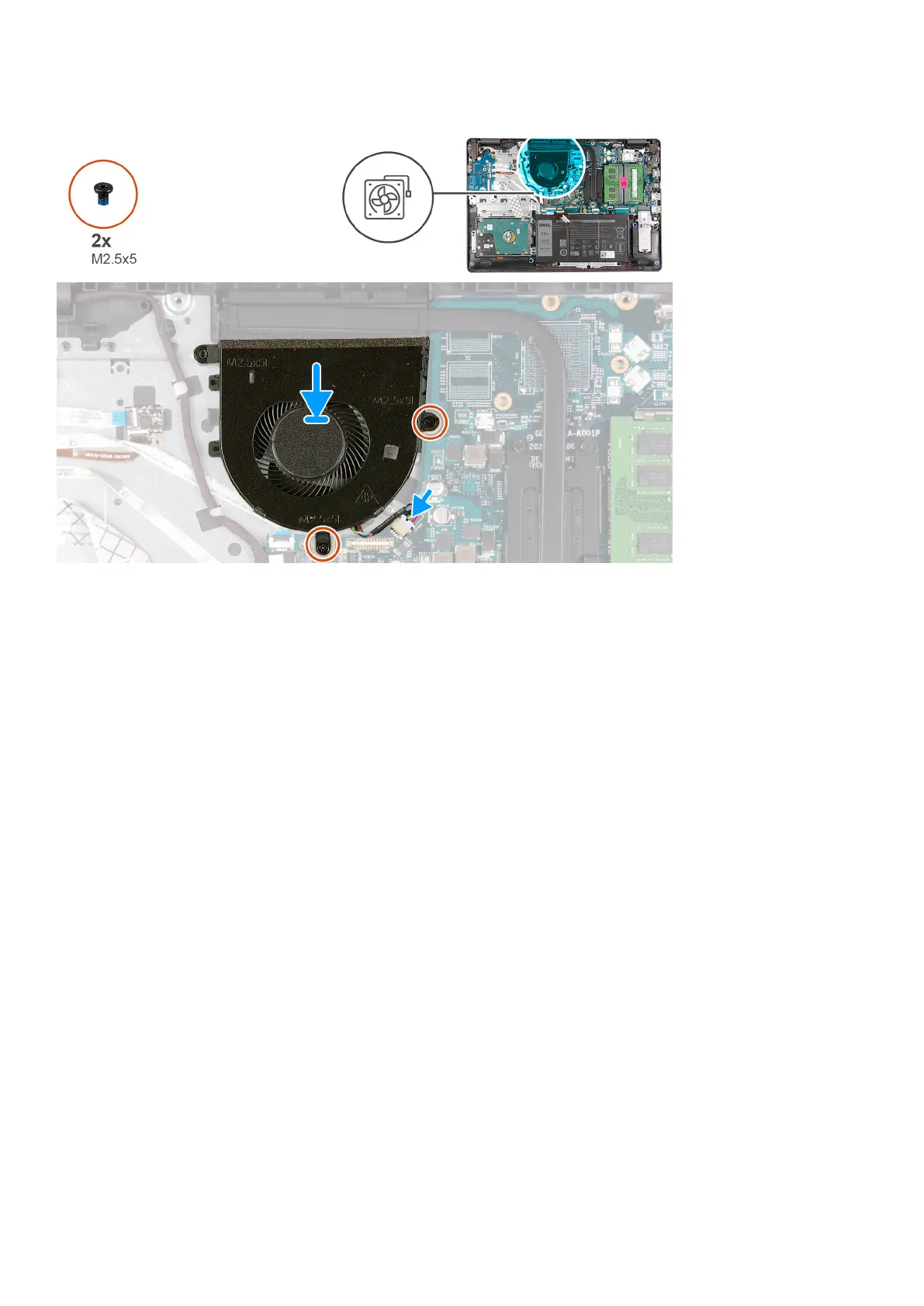 2. Replace the two screws (M2.5x5) that secure the fan to the palmrest.