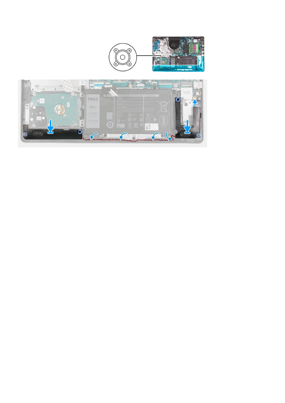 1. Using the alignment posts and rubber grommets, place the speakers in the slots on the palm rest.