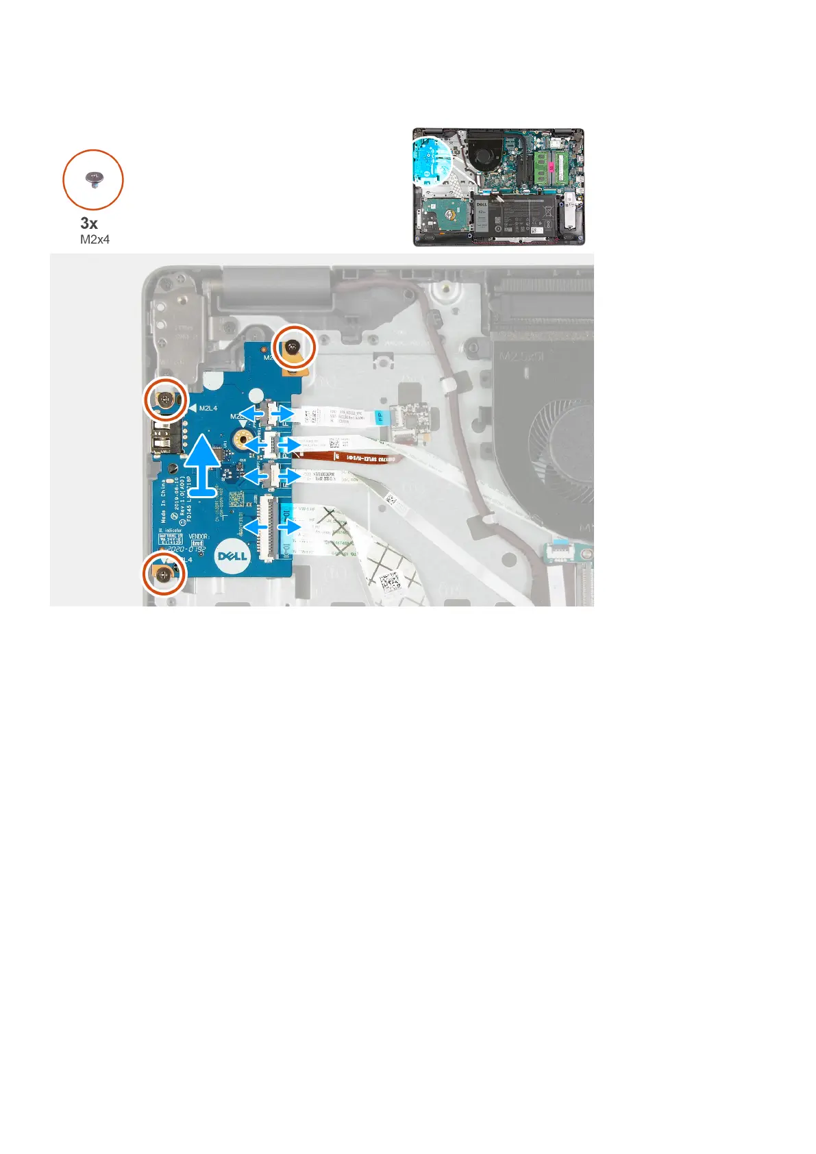 4. Remove the three (M2x4) screws that secure the IO board to the palmrest, and remove the IO board from the system.