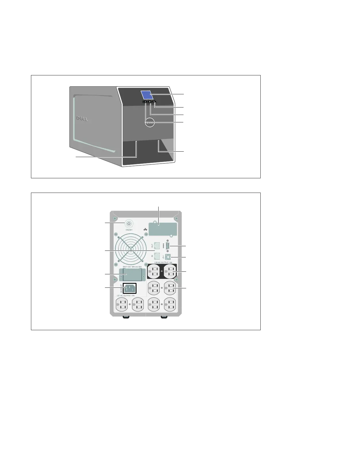 Cette section montre un panneau avant et arrière de l'onduleur Tour Dell. Reportez-vous au Guide